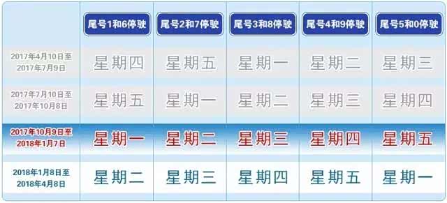 (三)自2017年10月9日至2018年1月7日,星期一至星期五限行机动车车牌尾号分别为:1和6、2和7、3和8、4和9、5和0;