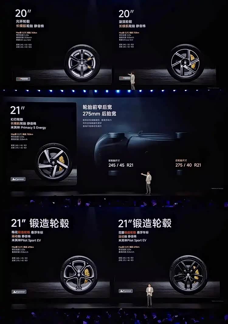 据官方透露,小米YU7已经对40多个风阻位置进行了优化,其风阻系数达到了0.245。据了解,这款车配备了10组贯穿式风道和19个风口。在轮毂的选择上,小米YU7提供了三种不同的尺寸选项:19英寸(前后轮胎规格245/55R19)、20英寸(前后轮胎规格245/50R20)以及21英寸(轮胎规格前245/45R21、后275/40R21)。