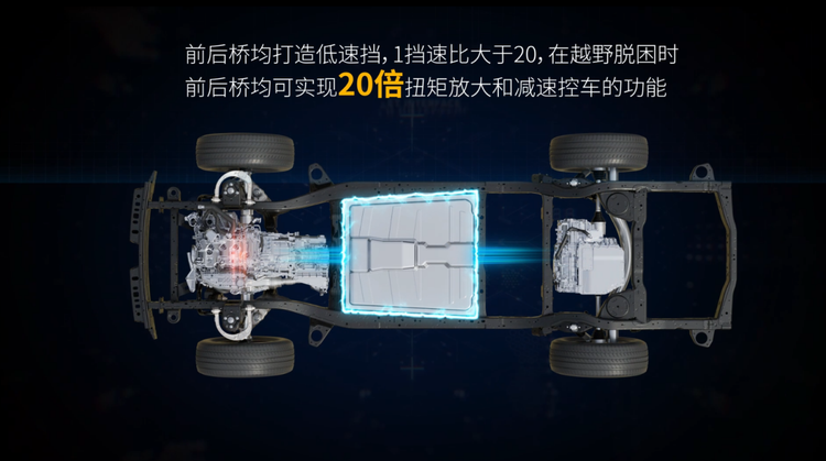强越野车型的核心技术支撑就是Hi4-T,非解耦四驱+3把硬锁的设计,即便一个轮子着地,也能让全车动力传递到这个轮子上。担心电池刮底?不存在的!专用越野电池被布置在大梁上,离地间隙是整车最小离地间隙 2倍以上,最大限度确保安全。即便发生极端小概率故障,还有油电双保险系统,以12V启动机作为安全备份,电池故障,那么它就是一台发动机驱动的四驱越野车,发动机故障,断开离合,它就是纯电四驱越野车。