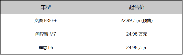 从当前定价情况来看,岚图FREE+预售价22.99万元起,预售期间下订可享受总价值2.1万元的小订权益,订金膨胀权益2000元抵5000元,还可免费升级价值1.8万元的高阶包,包括四门电吸门、主副驾双头枕音响、四活塞运动卡钳。问界新M7售价24.98万元起,目前市场优惠至高达2.6万元,限时赠送ADS权益。理想L6售价24.98万元起,订金膨胀权益5000元抵10000元车款。