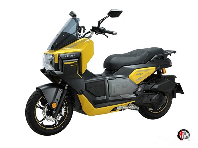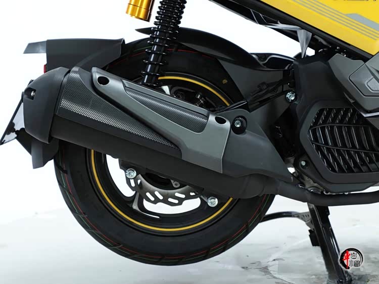 机甲蜂设计语言采用纯正机甲风,线条硬朗锋利,全身充满立体切割和几何折角,跟圆润的传统踏板彻底划清界限。前脸采用X型分离式LED日行灯(带呼吸效果),嵌在熏黑小风挡里,活脱脱“机械复眼”的效果,符合其科技品牌的定位。黄黑撞色灵感来自大黄蜂,荧光黄点缀黑色车身,战斗感十足。