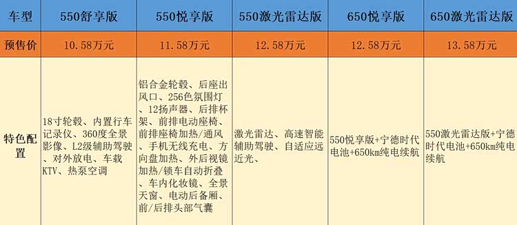 与550激光雷达版售价相同的还有一款650悦享版,该版本在550悦享版的基础上换装了宁德时代电池,纯电续航进一步提升至650km。同理,顶配的650激光雷达版与550激光雷达版的区别也是在电池和续航方面。