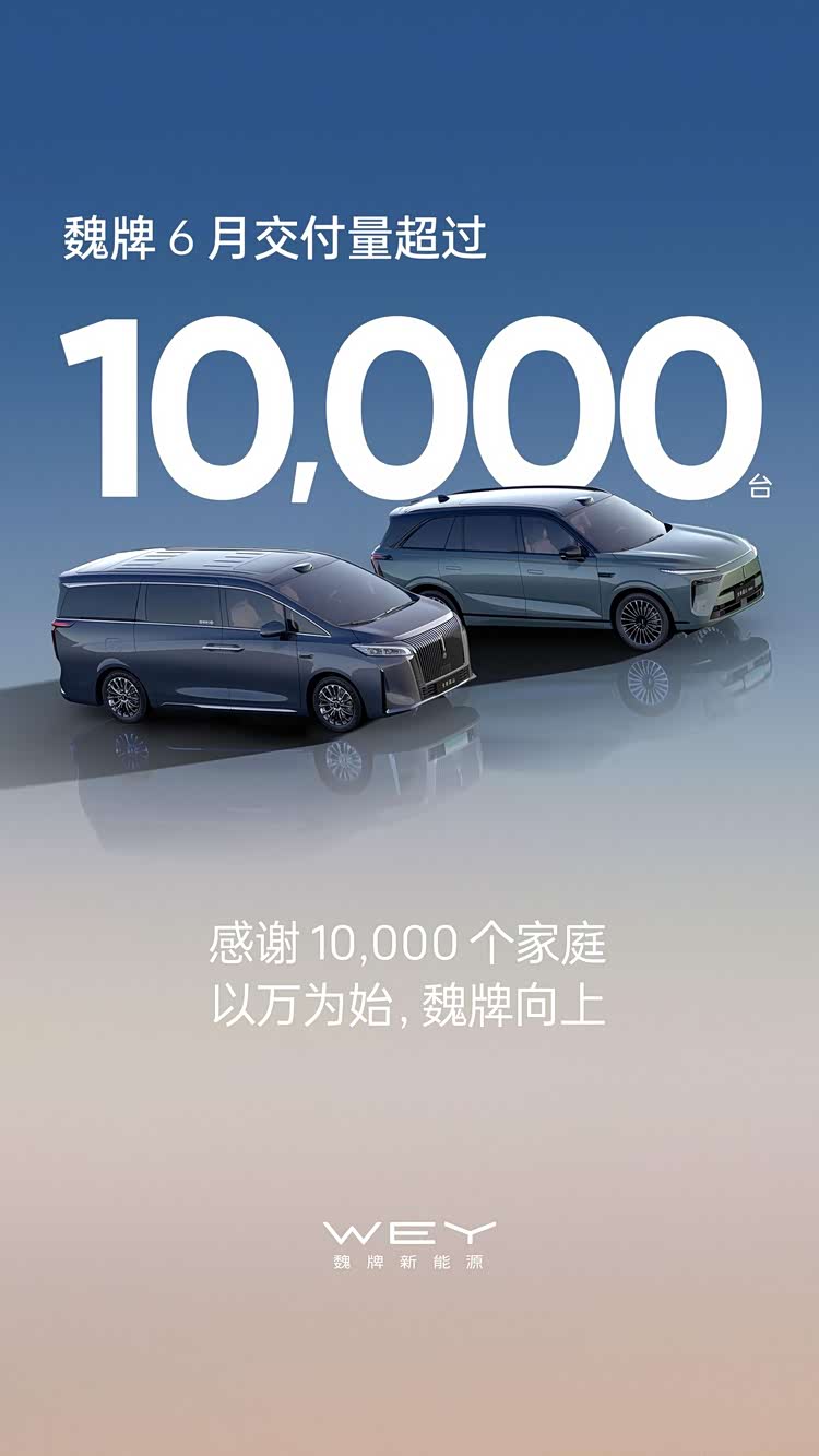 当行业浮躁时,魏牌选择深耕;当市场跟风时,魏牌坚持创新。魏牌6月交付过万,不仅是数字的跃升,更是长期主义的回报,是超10000个家庭沉甸甸的信任。未来,魏牌将以万为始,持续以用户为中心,为中国家庭提供高品质出行方案。