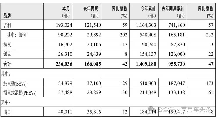 - 极氪科技 2025年6月销量43,012台,连续四个月月销超4万台,1-6月累计销量超24.4万台,同比增长14.5%。其中,极氪品牌6月销量16,702台,1-6月累计销量90,740台;领克品牌6月销量26,310台,1-6月累计销量154,137台。