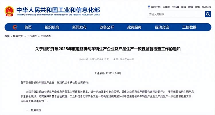 6月9日,工信部发布《关于组织开展2025年度道路机动车辆生产企业及产品生产一致性监督检查工作的通知》,宣布对已获批生产的汽车开展一致性监督检查工作,重点核查车辆参数、质量保障体系与公告信息的匹配性。