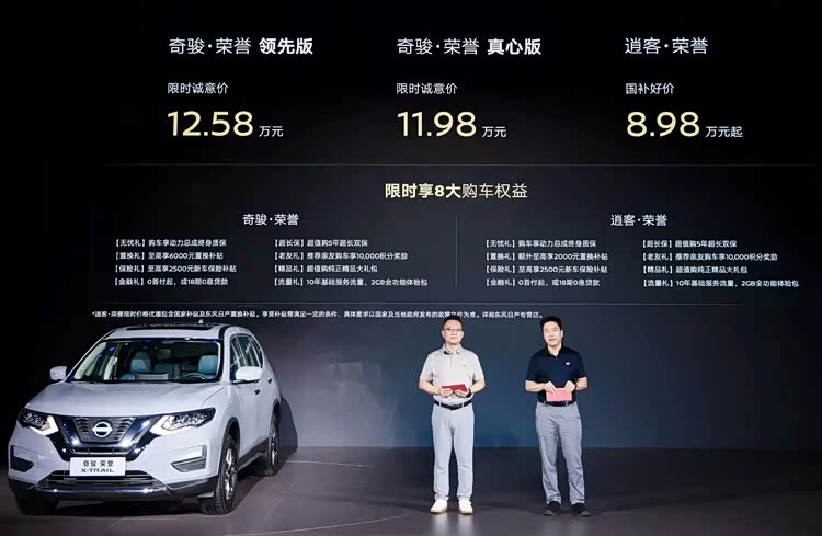 东风日产奇骏·荣誉车型已经上市,新推出了两款车型,其指导价格范围是16.08-16.68万元,而限定时间内的诚意价分别为11.98元和12.58万元。这款新车是基于第三代奇骏车型设计的,主要的升级方向集中在配置和内部装饰设计上。