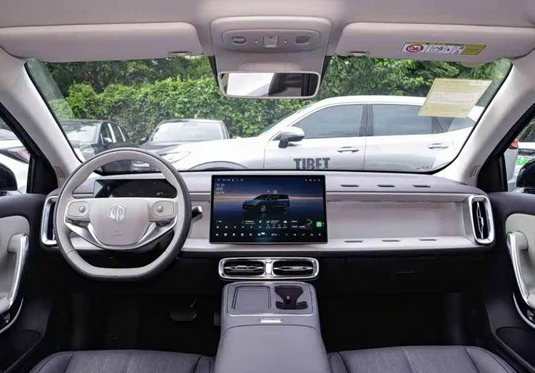 零跑B01的内饰主打科技简约风。中控台布局简洁,大量采用软性材质和皮质包裹,触感柔软。车内配备了超大尺寸的一体式联屏,集成了仪表盘和中控屏的功能,显示清晰,科技感爆棚。同时,车内还采用了大量的氛围灯设计,可根据不同的驾驶模式和用户喜好调节颜色,为驾乘者打造出浪漫的车内氛围。