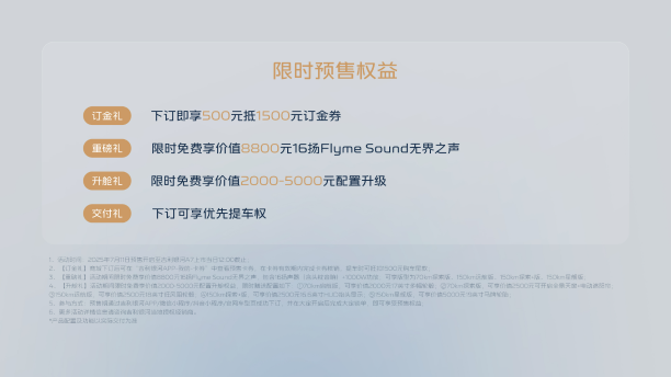 预售期间,银河A7还推出了多项权益:500元抵1500元的订金券、价值8800元的16扬声器Flyme Sound音响、2000-5000元的配置升级等,进一步提升了性价比。