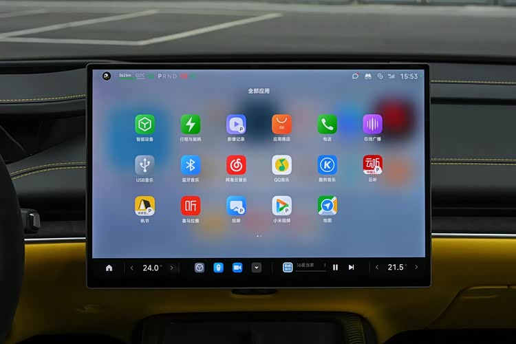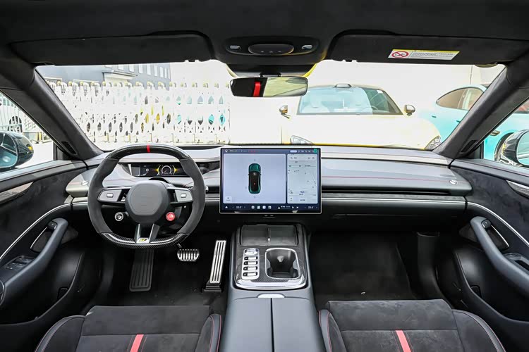 小米SU7 Ultra的内饰就没有外观造型那么激进了,采用的是T字型的设计布局,车厢内配备了大量的翻毛皮材质以及碳纤维材质,几乎大部分元素都是在彰显运动化风格,上下平底样式的多功能方向盘也是采用了翻毛皮材质以及碳纤维的组合,不仅运动感十足,而且手感十分细腻,支持上下前后四向电动调节,并配备了记忆和加热功能,7.1英寸的全液晶横向窄屏幕看起来尺寸不大,但是也给配备了抬头显示系统(HUD),所以驾驶员查看行车信息是没有任何关系的,而中控台则搭载了一块带有Xiaomi HyperOS车载智能系统的16.1英寸液晶大屏,分辨率高达3K,并内置了高通骁龙8295车载智能芯片,支持手机App远程控制、高德地图导航、蓝牙/车载电话、Carlink、CarPlay、车联网、OTA升级、面部识别、语音识别控制系统以及Wi-Fi热点等功能,智能化表现十分出色。