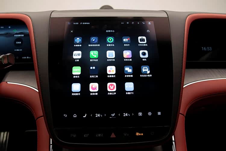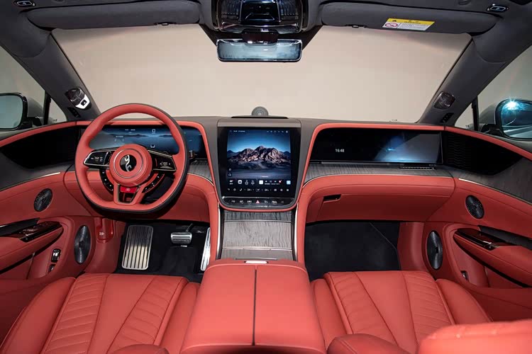 仰望U7 EV的内饰采用的是对称式的环抱设计布局,展现出了一定的新能源化风格,车厢内采用了大量的皮质包覆,使其手能够触摸到的地方十分细腻,三幅式的多功能真皮方向盘造型时尚美观,支持上下前后四向电动调节功能,并带有记忆和加热功能,23.6英寸的全液晶仪表盘+抬头显示系统(HUD)可以提供丰富的行车信息,中控台则搭载的是一块12.8英寸的液晶屏幕,配备的是DiLink车载智能系统,整体的操作流畅度和响应速度都是非常快的,目前主流的科技配置功能也均有配备,特别是这套语音识别系统功能非常好用,支持多个地方的方言识别,交互起来没有任何压力,副驾驶前方还带有一块23.6英寸的娱乐屏幕,这四块屏幕还支持联动功能以及多指飞屏操控,实用起来比较方便。换挡形式为电子式怀挡,并在前排扶手处配备了手机无线充电功能以及4个USB/Type-C的多媒体接口,能够保障多个电子设备的充电需求。