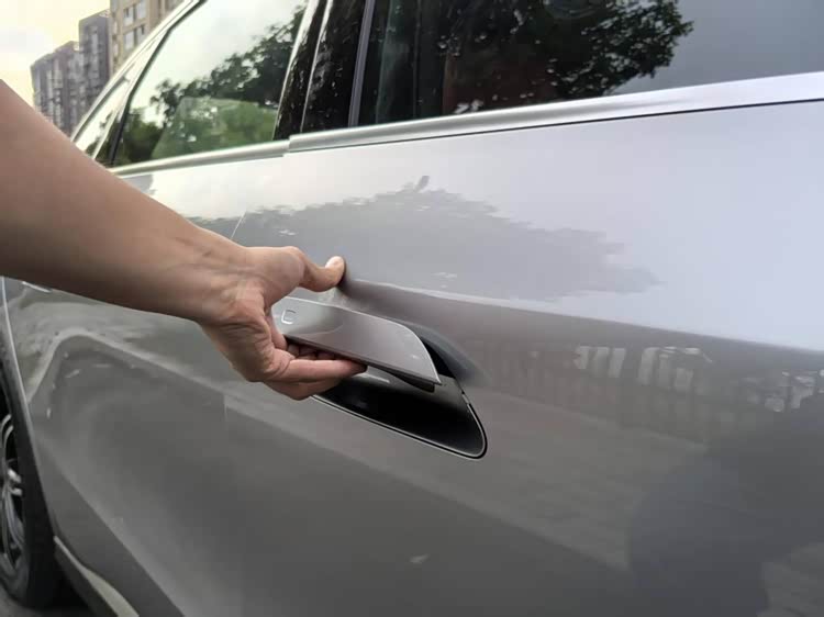 外观大家都熟悉了,不再细说,几个细节还是很不错的,首先就是车外的半隐藏式门把手,采用机械的开启方式,并且顶配车型还能支持电动开启,手伸进去,车门就自动弹开了,和问界M8的门把手很相似,既能降低风阻还能保持美观,感觉这种样式的门把手在新能源车型里已经近乎是最优解了。