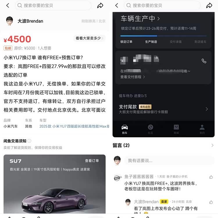 实际上,自FREE+开启预售以来就异常火爆。上市当天,随着价格与配置的正式公布,大量用户涌入直播间抢购,引发了订单量的飙升,也导致在闲鱼上涌现大批“加价求单”的帖子。据观察,不少黄牛以数千元溢价公开收购订单资格,并声称“价格不满意还可以再聊。更有一则北京用户帖子引发热议:“小米YU7订单换FREE+,7月提车可加价”。此类现象侧面印证了FREE+的市场竞争力和当下用户对智能新能源的迫切需求——华为的领先智能配置、央企沉淀的造车基因、全球首个全拟真换挡系统岚擎模式带来的情绪价值等,从硬件配置到超强体验碾压同级。