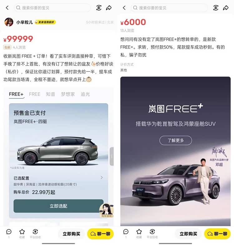 有车网特约报道:黄牛的“业务触角”正伸向新能源汽车赛道。近日,某二手交易平台涌现大量高价求购 岚图FREE(参数|询价)+订单的帖子,甚至有用户发帖“愿用某新势力YU7订单加价交换FREE+提车名额”。这场订单争夺战的源头,是7月12日岚图FREE+的正式上市——全系标配华为乾崑智驾ADS 4.0与鸿蒙座舱5.0,21.99万的起售价叠加46000元首销权益,引爆市场热情,上市15分钟大定锁单即突破1.1万台,市场反响远超预期。