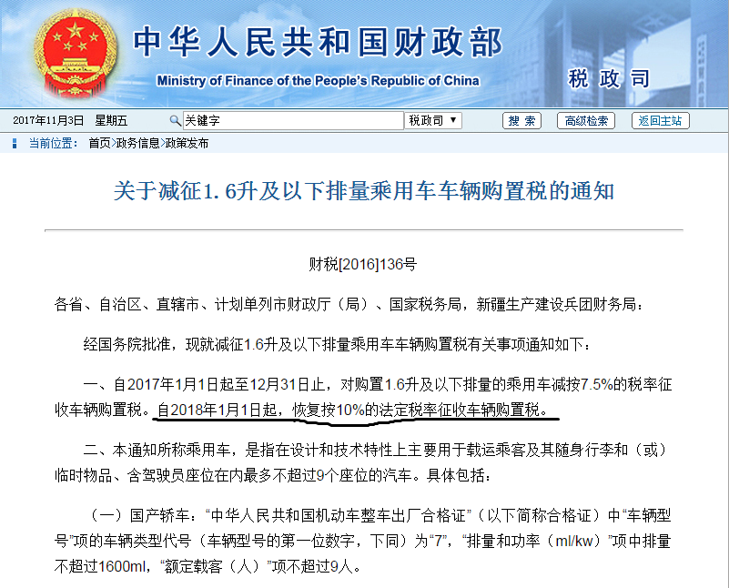 购置税调整的政策是在去年12月31号公布的,可能更多的人是关注2017年,其实来自国家财政部的这份文件里还有这样一句话: