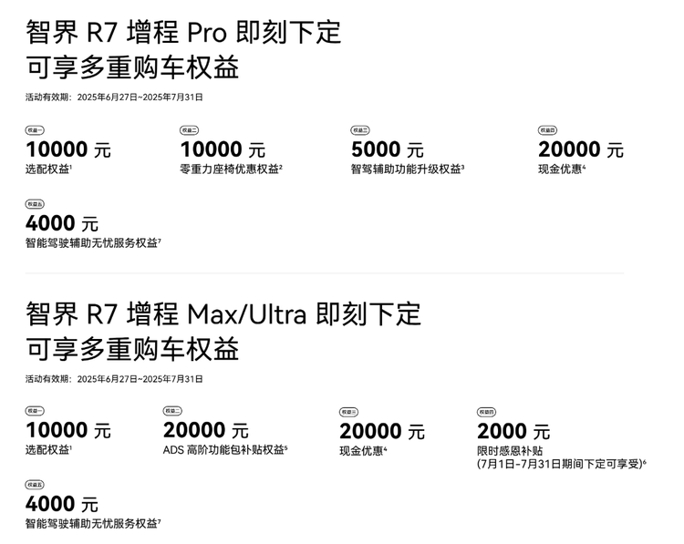 当前,现款智界R7正处于改款前夕,厂商推出“2万元现金补贴”政策,入门版实际入手价下探至22.98万元。更关键的是,2026年1月1日起,新能源汽车购置税将由免征调整为减半征收——以R7纯电版为例,现在购车可节省约1.5万元购置税成本,而改款后新政策下购车成本将增加近2万元。