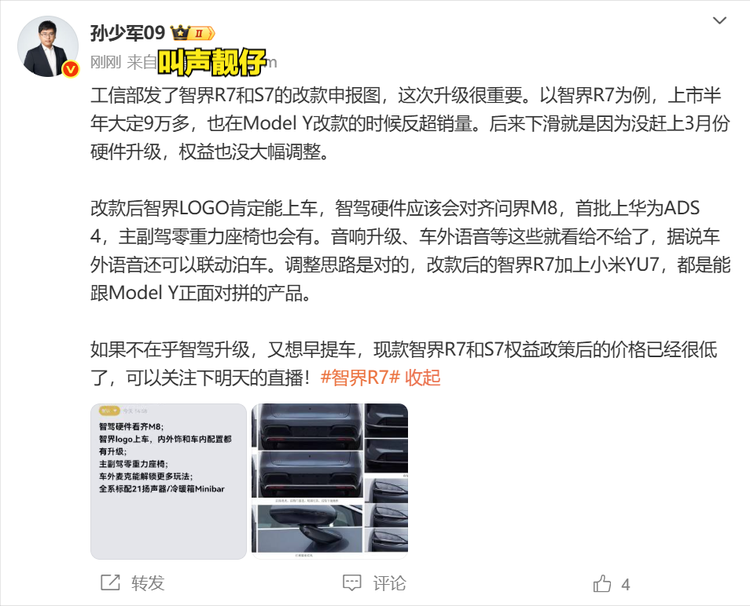 近日,工信部第396批《道路机动车辆生产企业及产品公告》正式公示,鸿蒙智行旗下 智界R7(参数|询价)与智界S7的改款车型赫然在列。此次改款以智驾升级为核心,不仅在硬件配置上看齐问界M8,预计还将升级华为ADS 4,为用户构建起覆盖全场景的智能出行解决方案,有望在下半年重回销量巅峰。