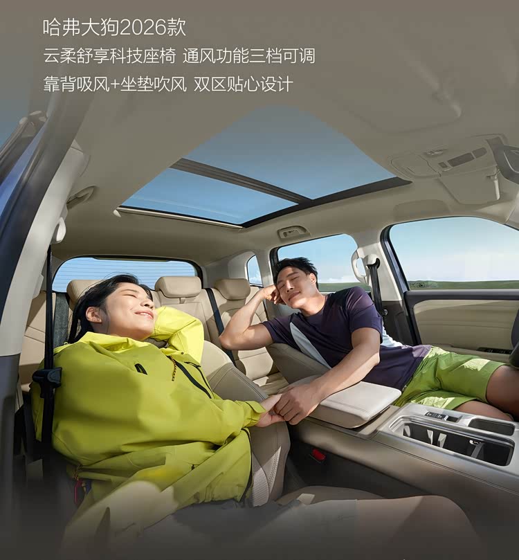 座椅方面,2026 款哈弗大狗配备云柔舒享科技座椅,优化了座椅曲线,采用四层结构设计,承托感更强。同时,支持座椅通风(靠背吸风 + 坐垫吹风双通风,三档调节)、座椅加热(加热速率提升 50%)、新风系统等功能,为用户带来四季舒适的驾乘体验。车内空调搭载森氧科技新风系统,集成等离子发生器、AQS 空气质量控制、自动除雾三大功能,可有效净化车内空气。此外,新车还采用了双层夹胶玻璃,降低了高速行驶时的风噪和胎噪,100 码巡航车内分贝值比 CR-V 还低 2.3 分贝。