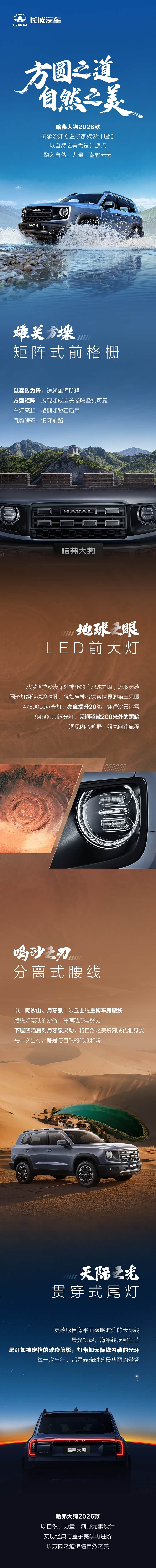 2026 款哈弗大狗通过设计、智能、动力、舒适性等方面的全面升级,进一步强化了 “可城可野可潮” 的全场景优势。其独特的方盒子造型、强大的越野性能、智能的座舱系统以及丰富的空间配置,满足了用户对多元化用车的需求。作为泛越野方盒子市场的开创者与引领者,哈弗大狗凭借精准的市场定位和不断进化的产品力,有望继续保持细分市场的领先地位。7 月 17 日,2026 款 哈弗大狗(参数|询价)即将正式上市,让我们共同期待这款 “潮玩旅伴” 的精彩表现!