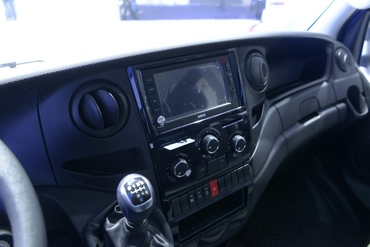 中控台使用了微微凸起的设计,上面的按钮清晰可见,触手可及。下面一排按钮最左边标注了一个“E”字母的其实是ECO经济模式的开关,这个模式简单来说就是从全负荷功率扭矩模式切换到ECO功率扭矩模式,使油耗和整车性能达到最优平衡来达到节能的效果。中间的显示器集成了依维柯的IVECONNECT移动互联娱乐系统,当然IVECONNECT系统还包括了车辆的倒车影像。