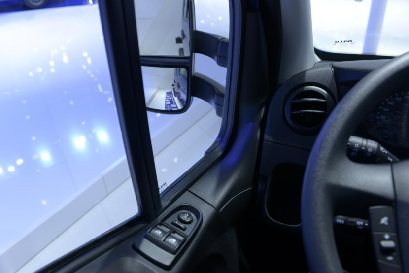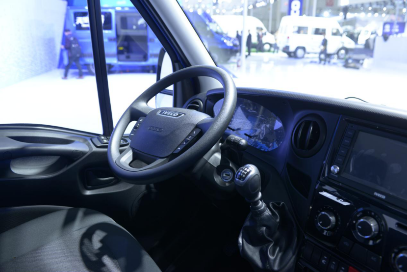 驾驶室内部的科技感十足,设计理念与意大利的依维柯全新一代 Daily几乎相同。方向盘的左后方设置了水壶架,而且保留了依维柯的左侧双拨杆设计。车窗扶手除了电动玻璃的升降按钮以外,还安装了多功能后视镜的控制按钮,只需波动控制按钮就可以控制左右两侧后视镜的角度,非常方便。除了能电动控制角度以外,后视镜还带有电加热功能。