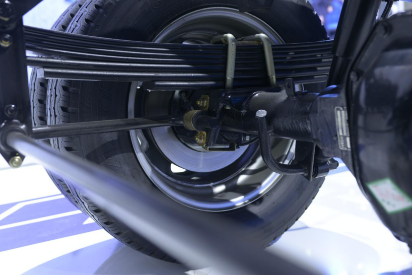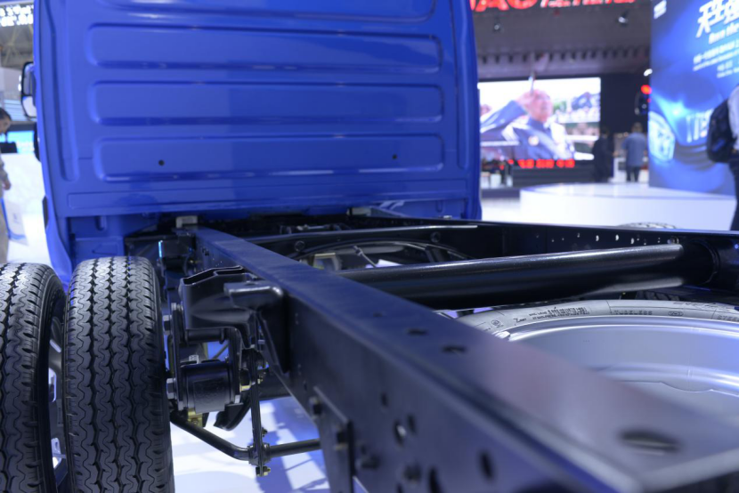 说完了纵梁我们再来说说横梁,全车一共采用了三根管截面横梁,管截面横梁的抗扭强度要比我们常见的工字梁要优秀许多。悬挂方面则采用了板簧+液压减震筒,气囊悬挂也是C45-33的选装配置,在运输贵重易碎品的时候减震效果出色的气囊悬挂就显得十分必要。