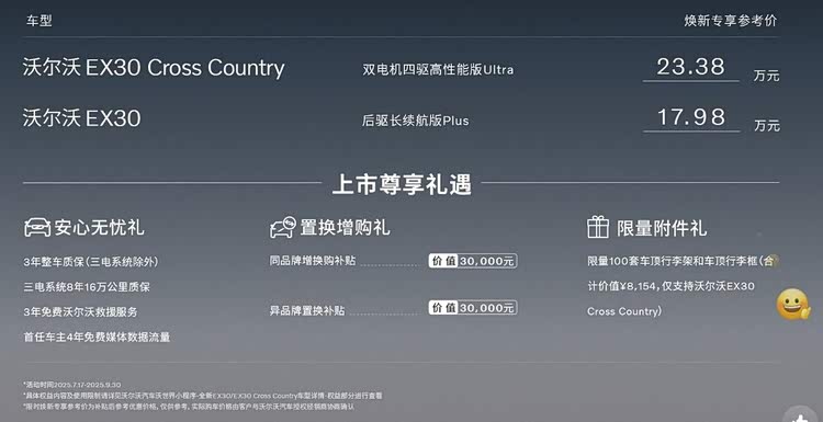购车权益方面,新车给到3年整车质保(三电系统除外)、三电系统8年16万公里质保、首任车主4年免费媒体数据流量、同品牌换购补贴30000元,异品牌置换补贴3万、限量100套车顶行李架和车顶行李框(合计价值8154元,仅支持沃尔沃EX30)等上市权益,诚意拉满。