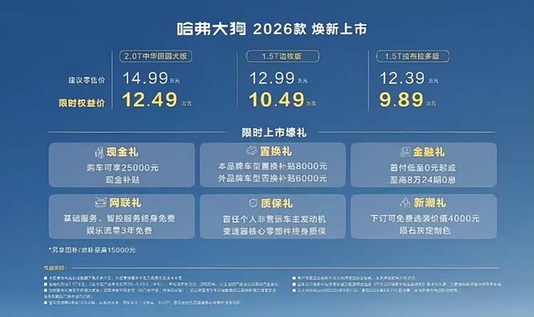 价格方面,哈弗大狗2026款诚意满满,限时权益价9.89万元起。共推出3款车型:1.5T拉布拉多版建议零售价12.39万元,限时权益价9.89万元;1.5T边牧版建议零售价12.99万元,限时权益价10.49万元;2.0T中华田园犬版建议零售价14.99万元,限时权益价12.49万元 。除了优惠的价格,还有限时上市壕礼。现金礼方面,购车可享25000元现金补贴;置换礼上,本品牌车型置换补贴8000元,外品牌车型置换补贴6000元。如果加上置换礼,在限时权益价9.89万元起的基础上还可以至高再享受8000的优惠,9万元多一点就可以入手。金融礼提供首付低至0元起或至高8万24期0息;网联礼让基础服务、智控服务终身免费,娱乐流量3年免费;质保礼给予首任个人非营运车主发动机变速器核心零部件终身质保;新潮礼下订可免费选装升级价值4000元陨石灰定制色。以上权益截止时间2025年8月31日,需在2025年8月31日前开票,详情可咨询当地授权经销商。