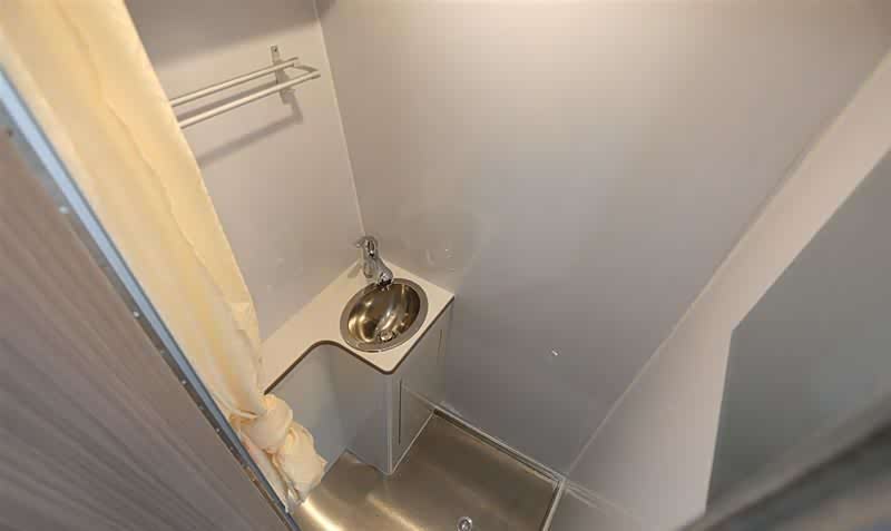 车内配有独立卫浴间,标配一台便携式马桶、洗漱台带内嵌式面盆、抽拉式淋浴喷头、毛巾架顶部有蘑菇头换气扇带照明灯。水路方面配有100L净水箱以及45L灰水箱带排污阀,还装有7L电热水器。