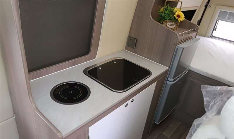 打造有内厨房操作台,配有电磁炉、带盖洗菜池、71L双开门车载冰箱以及收纳柜和顶部的储物吊柜。同时该车还配有柴暖系统,标配3000W逆变器、400ah胶体电池。车尾配有一张固定横置大床尺寸1800*1300毫米,上部安装有储物吊柜以及12V分体空调。