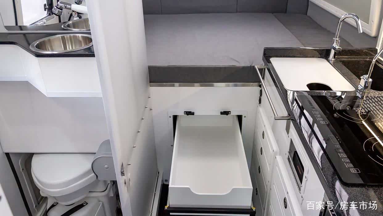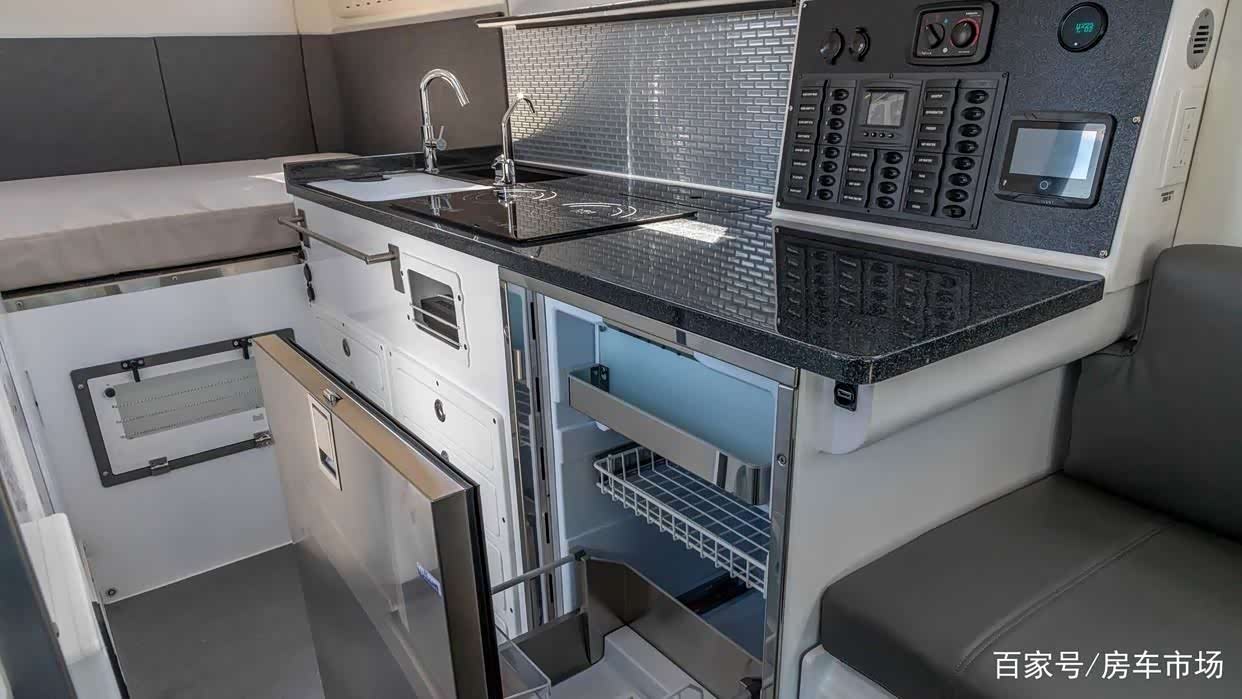 厨房则配备了玻璃台面,不锈钢水槽、车载冰箱和电磁炉。淋浴间设施包括推拉式隐藏马桶和淋浴花洒,此外,在用餐区附近安装了一个独立的咖啡机,平开式侧窗可以让充足的自然光在白天照亮室内。