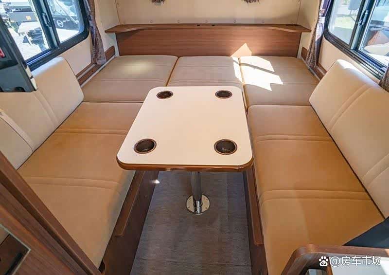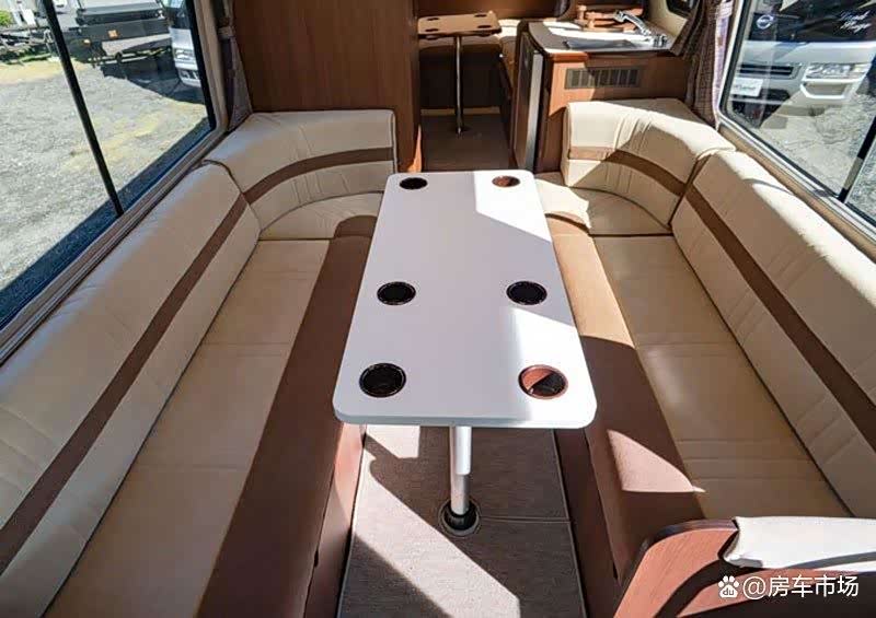 后部同样是一个会客区,中间设置了一个餐桌,降下餐桌可以拼成一张大床,尺寸为:2*1.8米,可以睡下3人。