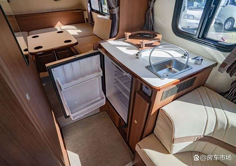 中部设置了橱柜,台面上配有不锈钢洗菜盆、带延长管的水龙头,柜子下面是一台85L车载冰箱,做饭时可使用卡式炉,清水箱和排水箱各20升。橱柜对面是衣柜,只是没有设置独立的卫生间。