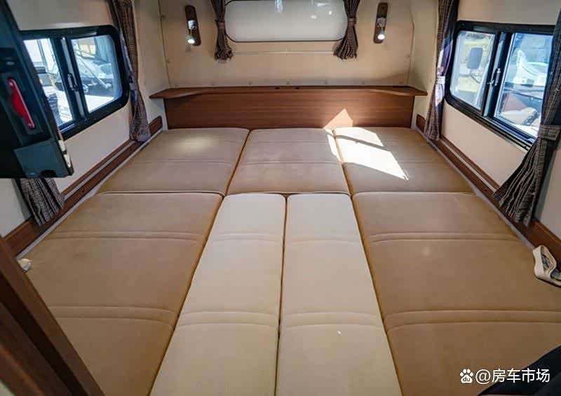 前部会客区空间大利用率高,休息时,降下中间桌子,只要把沙发靠背放到上部,可以拼成一张大床,尺寸可以达到2*2.2米,睡上两名成年人+两名儿童是可以的。