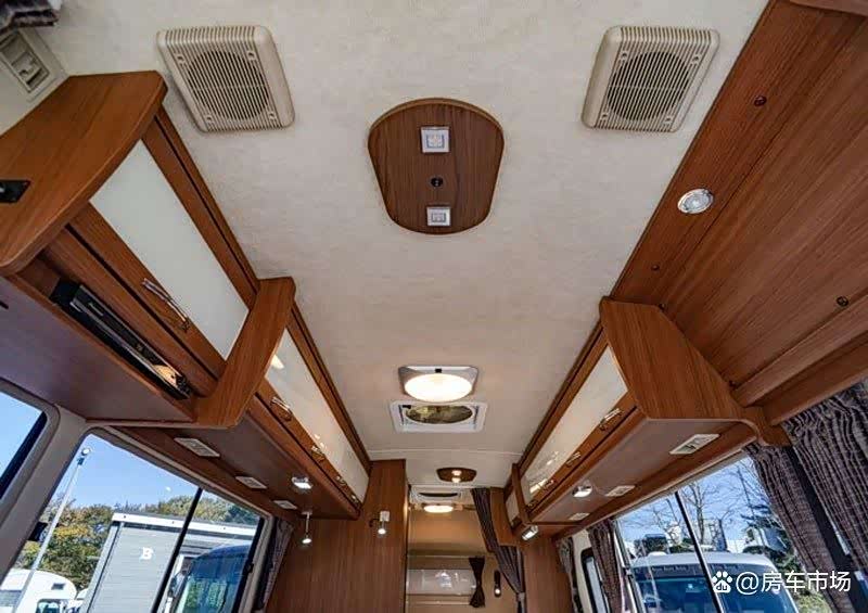 车顶两侧是吊柜,加装了不少物品,设置有冷风出口和暖风出口,顶部是两台换气扇和后置音响。