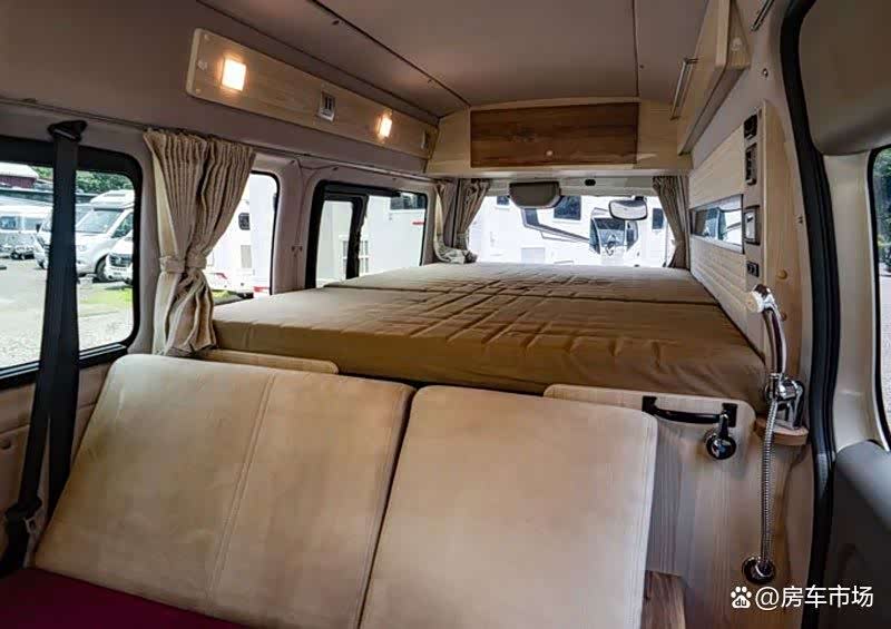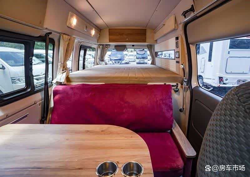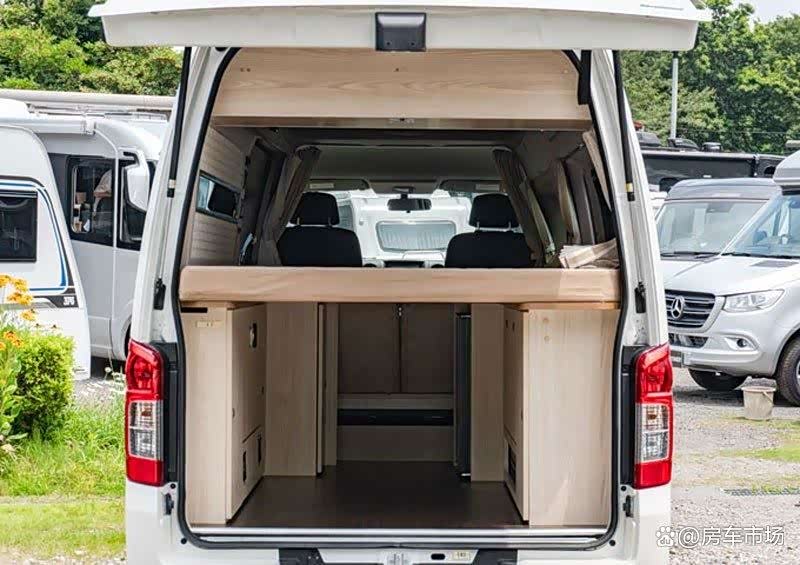 这台 日产NV350(参数|询价)大面包改装的露营房车,2.5T柴油动力充沛,车内空间不小,设置多用途平台,能办公能做饭,休息时可变大床,有些Vanlife的效果,更适合年轻人使用。