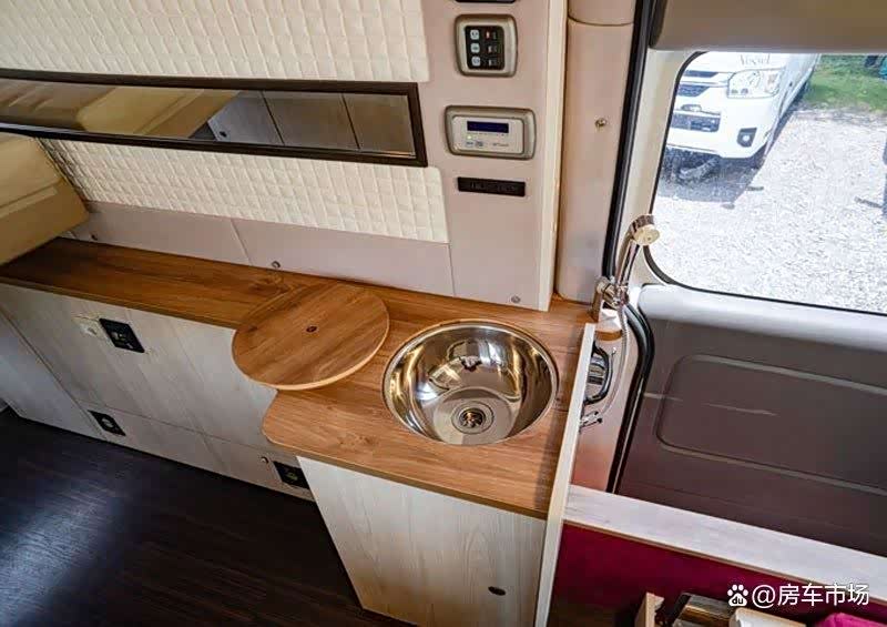将垫子拿掉,床下是一个工作平台,台面很宽敞,两侧都能放置物品,在这里可以办公,也可以做饭,一侧的下面安装的是一台65L车载冰箱,做饭使用便携式卡式炉,另一侧设有不锈钢洗菜盆,延长水龙头,可在车外使用,清水箱是19升,灰水箱式19升。