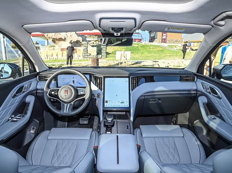 进入车内,红旗 HS7 PHEV 的内饰设计让人眼前一亮。中控台采用了大量的软性材质包裹,搭配上精致的缝线工艺,营造出了浓郁的豪华氛围。12.6 寸的中控大屏采用了竖置设计,显示清晰,操作流畅,集成了车辆的各种信息和功能,如导航、多媒体娱乐、车辆设置等。全液晶仪表盘同样科技感十足,能够根据不同的驾驶模式切换显示风格。此外,车内还配备了丹拿音响系统,10 个扬声器的布局为乘客带来了身临其境的听觉享受。在细节方面,车内采用了大量的镀铬装饰和钢琴烤漆面板,提升了内饰的质感。座椅采用了真皮材质包裹,具备通风、加热功能,进一步提升了乘坐的舒适性。