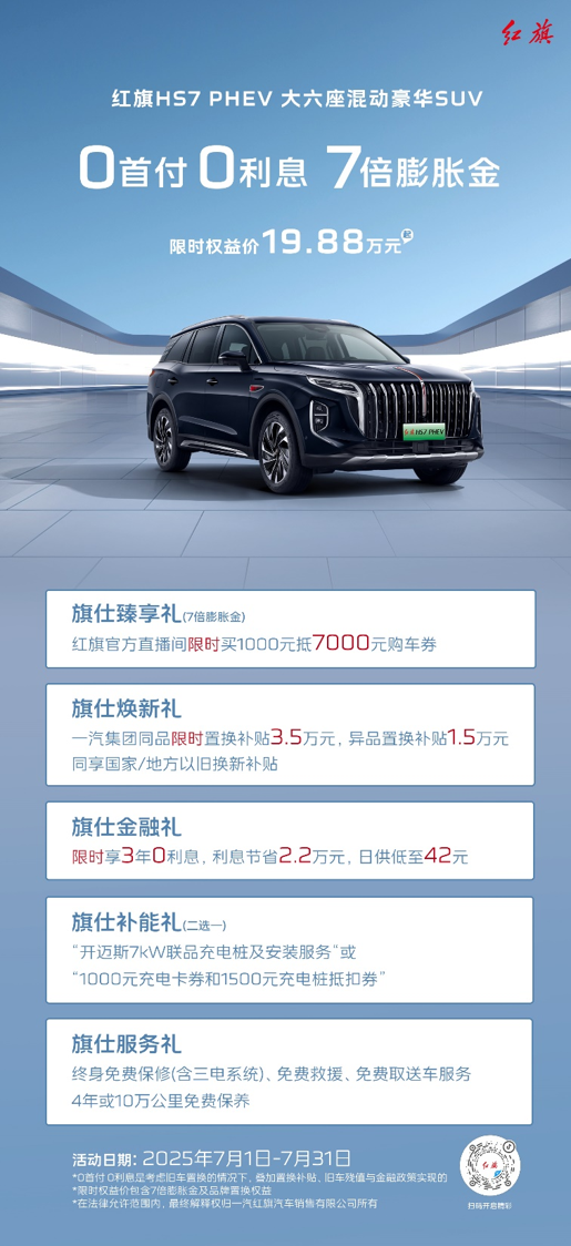 为回馈广大用户,红旗品牌在 7 月推出了极具吸引力的购车权益。首先是 7 倍膨胀金活动,在红旗官方直播间支付 1000 元,即可在购车时抵扣 7000 元。对于一汽集团同品置换的用户,补贴由原来的 2 万元提升至 3.5 万元;而异品置换(一汽外品牌)补贴也有 1.5 万元。金融政策方面,延续了 3 年 0 息的优惠方案,利息立省 2.2 万元,日供低至 42 元。以一汽同品置换两驱旗享版为例,官方指导价 290800 元,旗仕专享价 239800 元,通过官方直降 51000 元、购车券抵扣 6000 元以及品牌置换补贴 35000 元,购车权益价低至 198800 元,若再加上政府以旧换新补贴 15000 元,成交价仅 183800 元,且购置税全免,极大降低了购车门槛和成本。