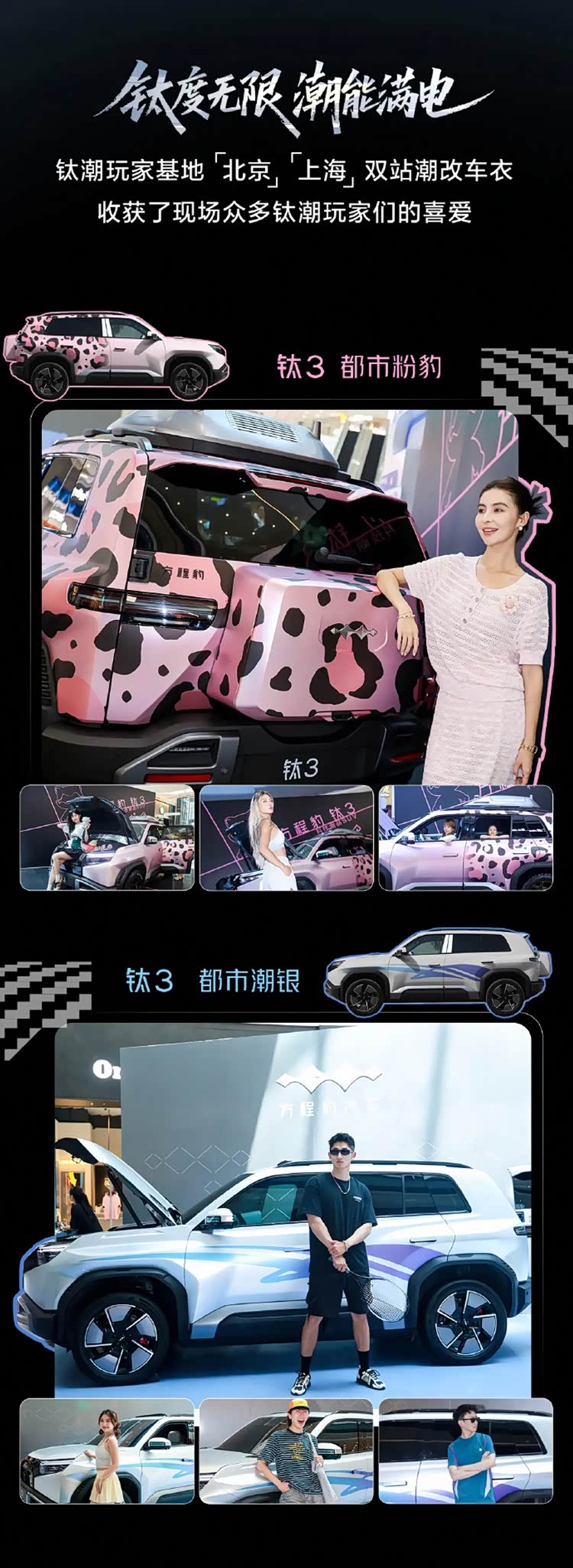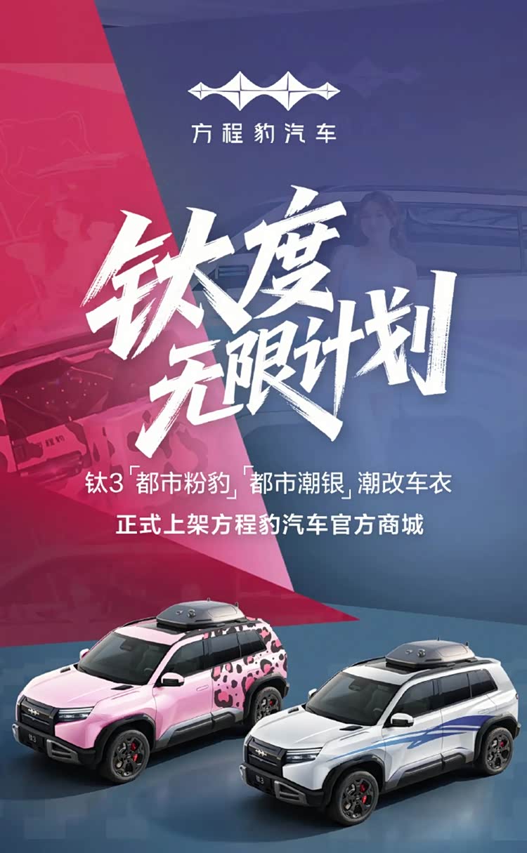 综合车身结构、空间布局与动力性能来看,钛3更适合寻求个性化造型、注重多用途功能、且有城市通勤与户外需求兼顾的年轻用户。此次新增的“都市粉豹”与“都市潮银”两款官方车衣,进一步提升了整车在城市场景下的适配度。