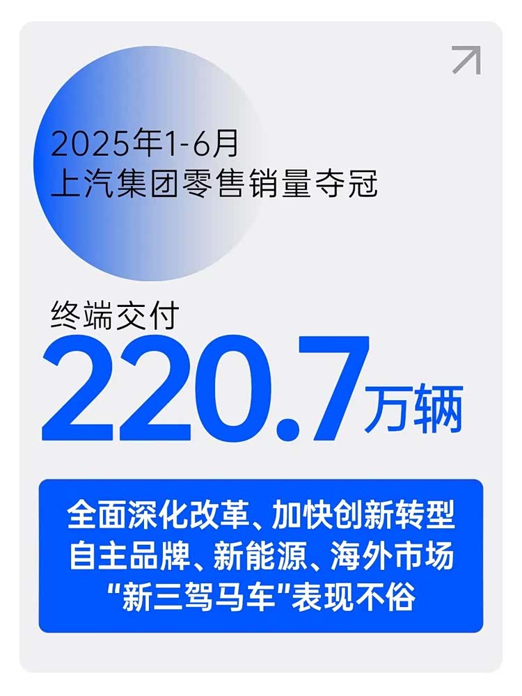 2025年上半年,中国汽车市场处于价格战硝烟与全球贸易不确定性交织的复杂环境中,面对逆境,上汽集团以205.3万辆的批售成绩同比增长12.4%,实现两位数增长,并连续6个月实现同比增长;终端交付量达220.7万辆,逆势实现销量“六连涨”,位列行业第一。