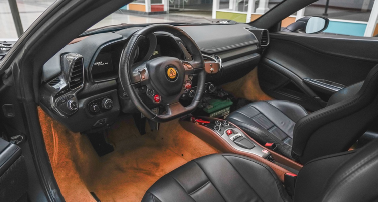 车内大多依旧保留458的传统风格,配备黑色真皮座椅、棕色地毯和白色转速表(最高9000转/分),而方向盘中央的高压警告贴和仪表盘上的切换开关则显露出这是一台实验性质的混动试验车。