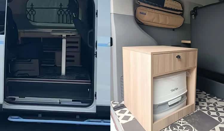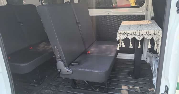 车内的设计相对常规一些,采用前后分区的布局形式,前方为乘坐休息区,提供了乘用车座椅和小餐桌,后方则是生活功能区,同时也是一个DIY区域,可以根据自己需求进行个性化改造,公示车型则采用了一个便携式马桶+储物空间的组合。