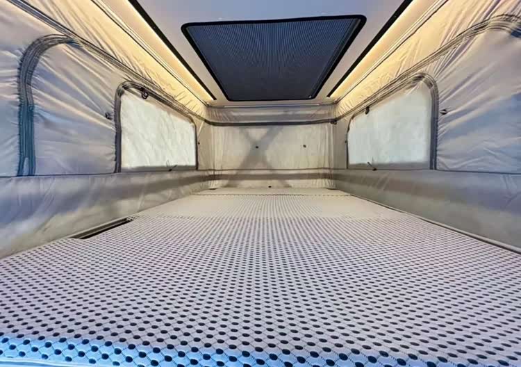 新车同样提供了一部电动升降车顶,打开以后可以在车内增加一张车顶双人床。生活区的设计采用前后两个分区,前方为四人乘客区,第二排为两张单人独立座椅。