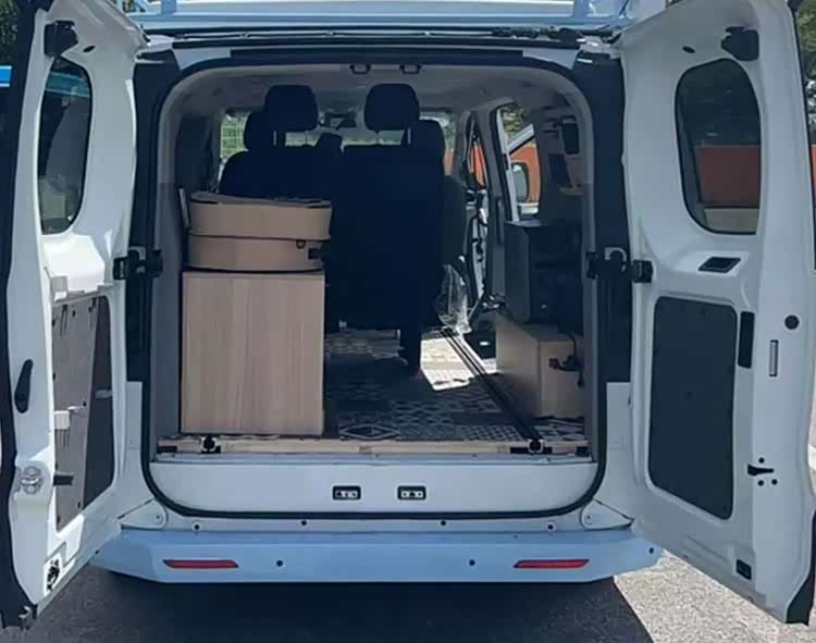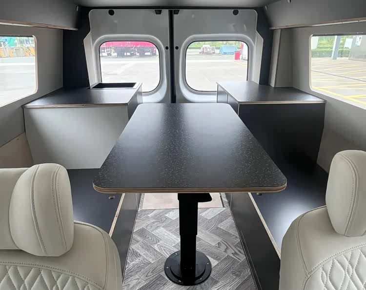 后方区域则为功能区,提供了对卡座餐桌以及简易橱柜等设施,可以在车内解决一定的用餐需求,另外还有一点值得注意的是,后方所有柜体高度均位于车窗边沿以下,如此带来的好处就是车内采光很好,不会有压抑感,日常乘坐更像是MPV而不是封闭货,预计这款车主要定位场景就是日常通勤和节假日露营。