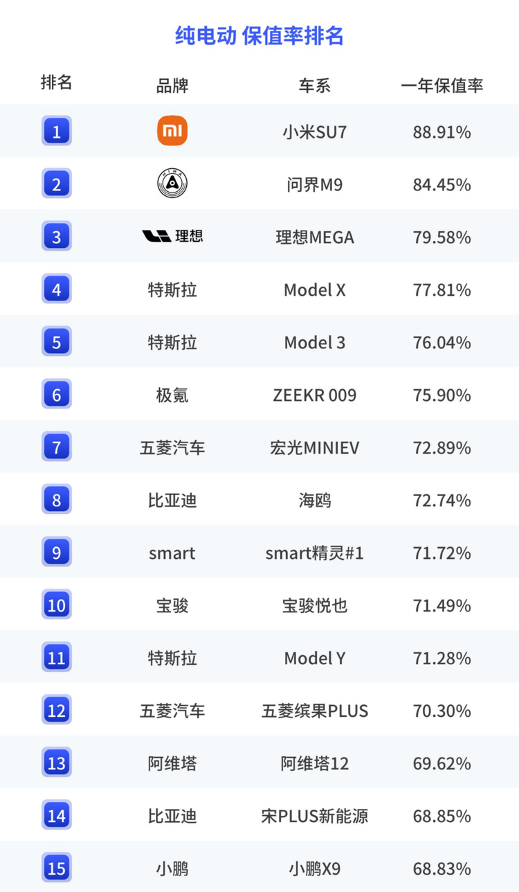 前些年电车还没有太普及的时候,很多人不买电车的理由是“不保值”,但伴随着新能源车逐渐成为主流,电车的保值率也逐渐提升。近日中国汽车流通协会发布了2025年上半年纯电车保值率排行榜,其中罗列出最保值的15款电车,销量颇高的Model Y居然没能进入前十。