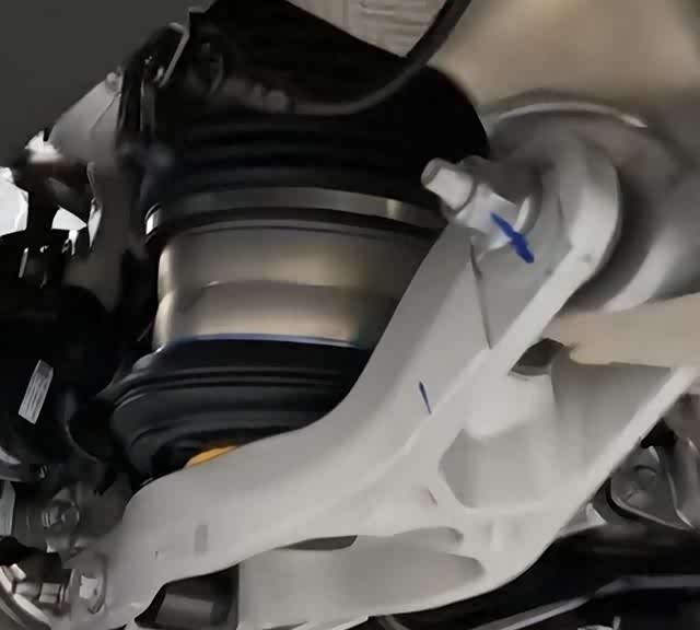 目光下移,后五连杆独立悬挂的三条铝制连杆格外引人注目。铝合金材质的选用,犹如为车辆装上了“轻盈的翅膀”,既减轻了簧下质量,又提升了操控响应速度。每一次转向、每一次加速,都能感受到它带来的精准与灵动。而空气悬架下方那粗壮的铝合金下支撑臂,宛如钢铁巨人的手臂,坚实而有力,给人满满的安全感。后部电驱框架同样采用铝合金材质,这种不惜成本的投入,彰显了问界M8对品质和性能的执着追求。