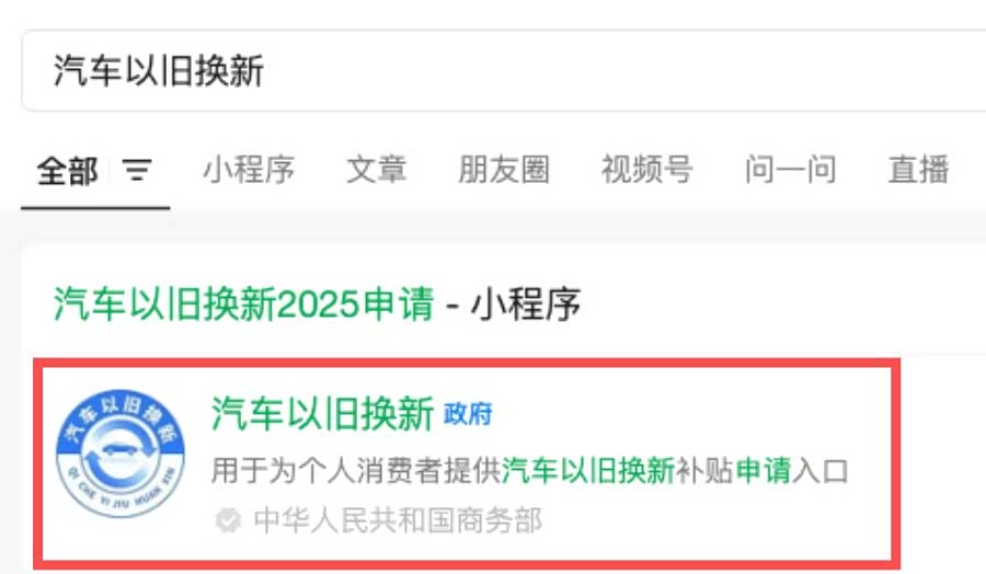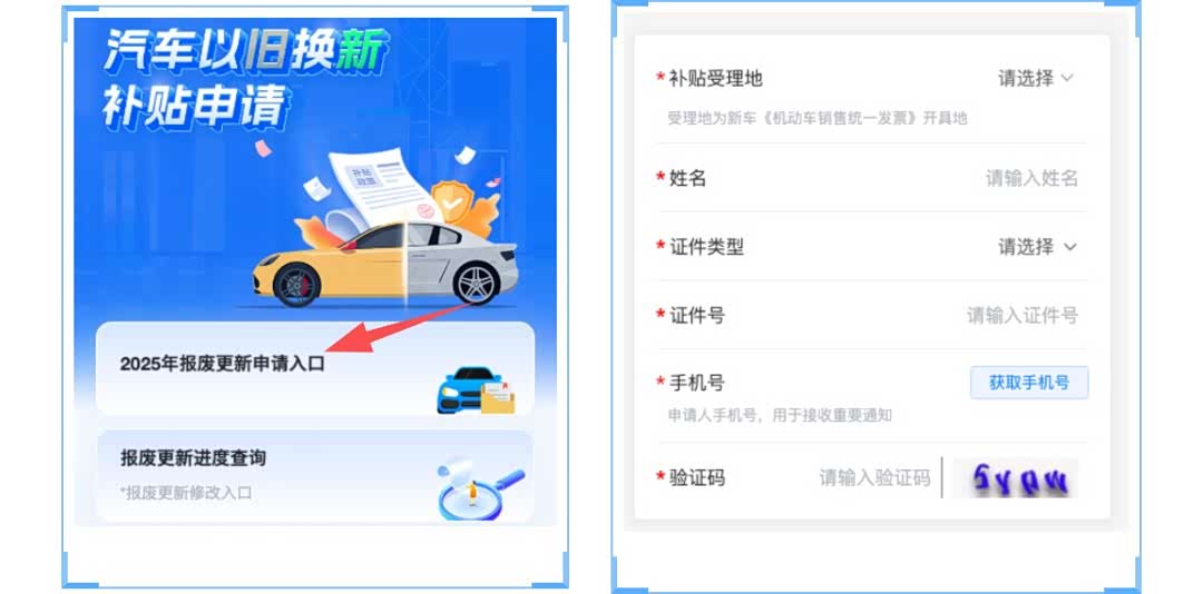 打开微信 / 支付宝 → 搜索“汽车以旧换新” → 点击进入小程序,找到【报废更新申请入口】。