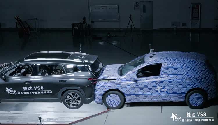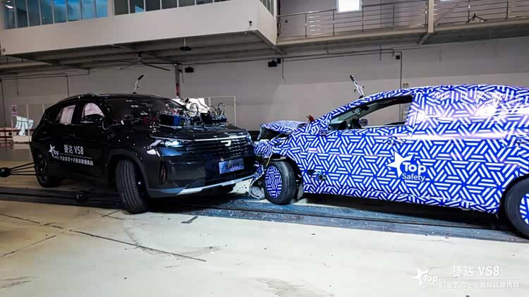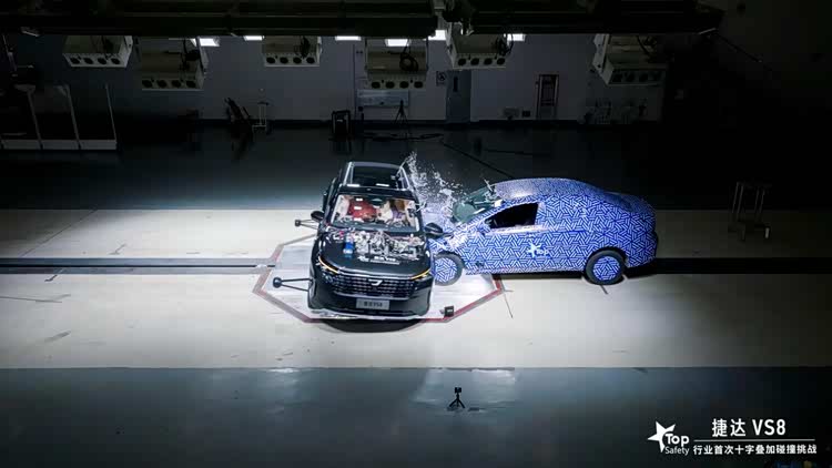 当一台1.6吨的SUV以60km/h狠狠撞向等红灯的捷达VS8车尾,巨大冲击力尚未消散,另一台1.5吨轿车又以60km/h拦腰撞上它的驾驶侧,这不是灾难片场景,而是捷达VS8在TOP Safety实验室经历的“十字夹击”炼狱。双重高速撞击叠加,整体碰撞能量远超国标2倍,模拟了真实道路最残酷的二次事故。面对这场安全大考,捷达VS8能守住车内一家大小的安全吗?