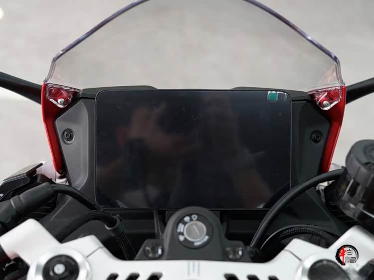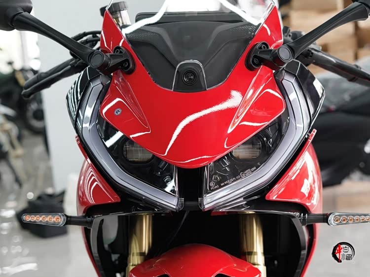 动力系统搭载一台直列四缸水冷引擎,实际排量为421cc,采用DOHC四气门结构设计,最大马力77.5匹,最大功率57kW/14000rpm,峰值扭矩39Nm/13000rpm输出,红线直逼14500rpm。技术破局点有三,冲压进气系统提升高速骑行的动力储备,同时3000rpm即输出80%扭矩,也能兼顾城市通勤的使用需要,配合滑动离合与双油门拉线,极速220km/h的性能释放更线性。