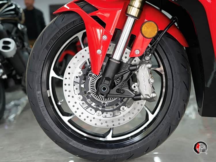 硬件方面,减震系统搭载Marzocchi 41mm倒置可调前叉+多连杆结构中置后减震,提供避震效果和精准操控性能的同时也可以根据需求进行个性化调整,提升舒适性。刹车系统采用前后盘刹,前300mm双盘+Brembo径向四活塞卡钳,后240mm单盘+对向双活塞卡钳,标配双通道ABS制动系统和TCS牵引力控制系统的双重加持。
